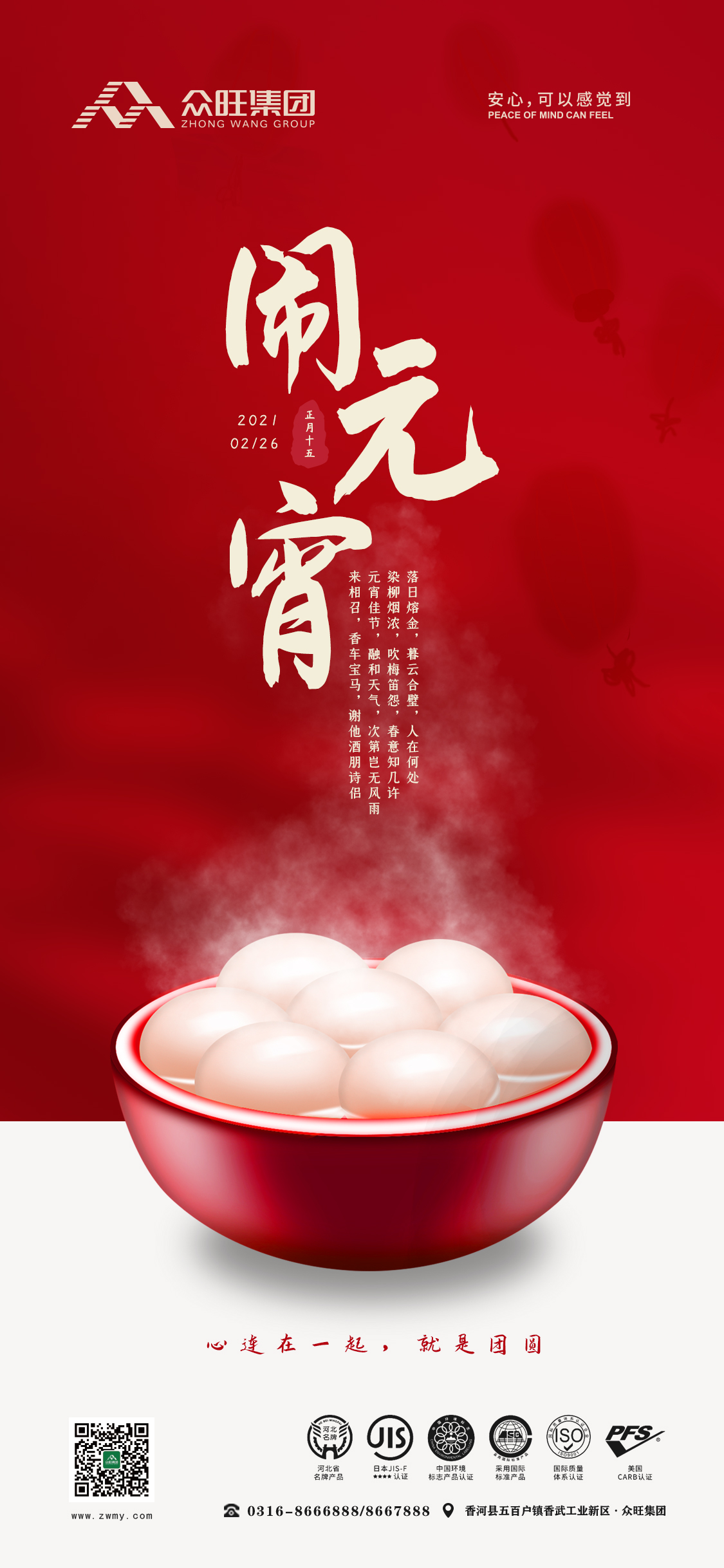圓圓如意圓圓連,圓圓祝福祝團圓。 眾旺集團攜全體員工祝各位朋友正月十五元宵節:日圓,月圓,團團圓圓!官源,財源,左右逢源!人緣,福緣,緣緣不斷!情愿,心愿,愿愿隨心!